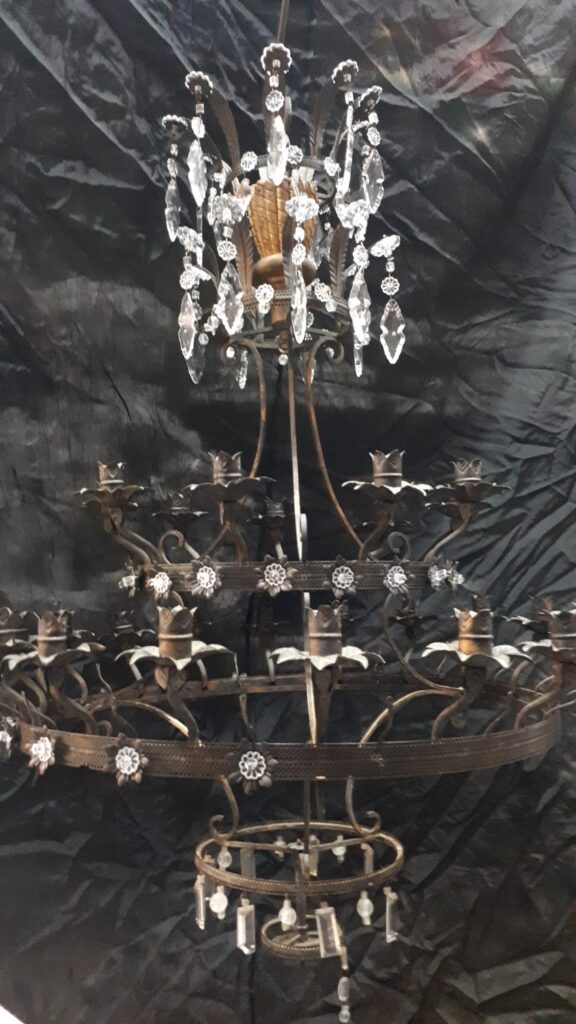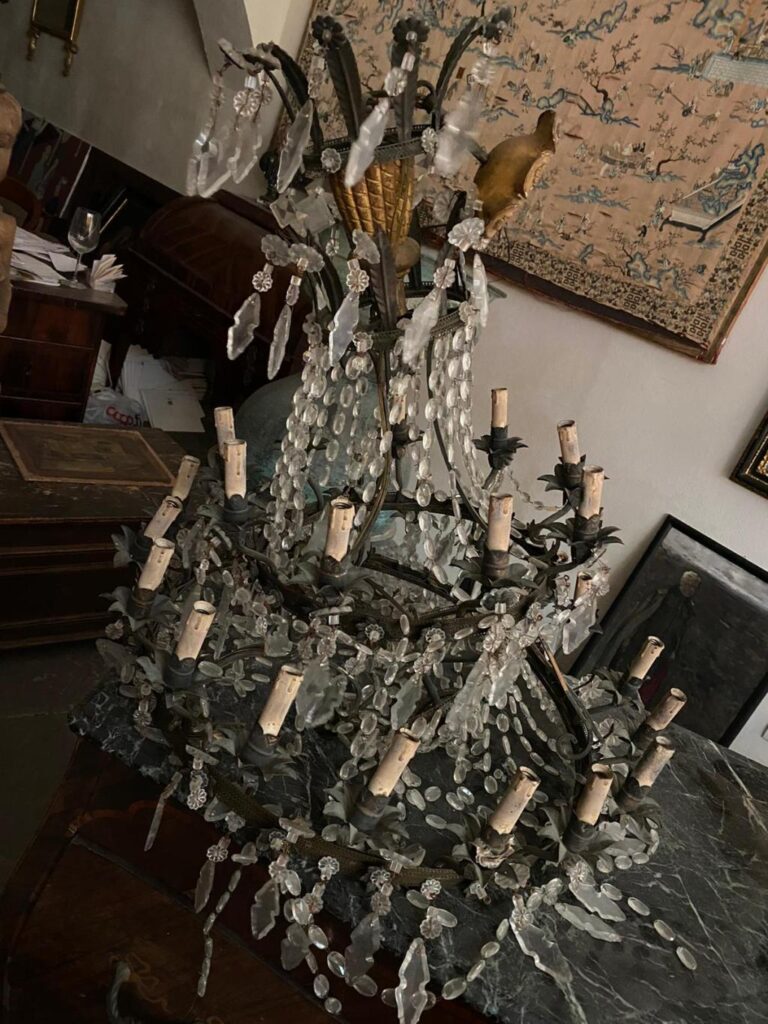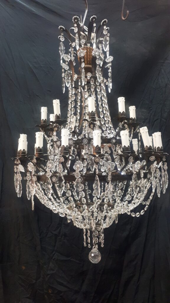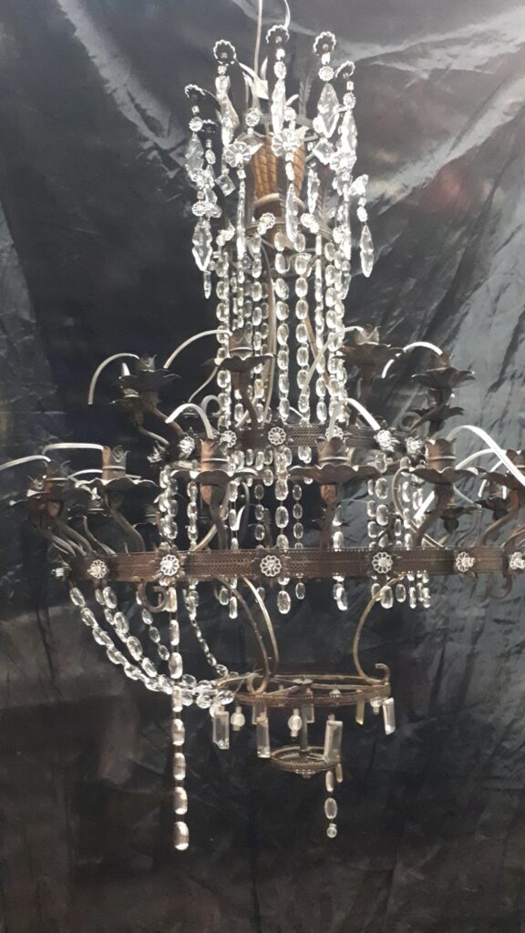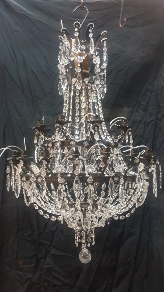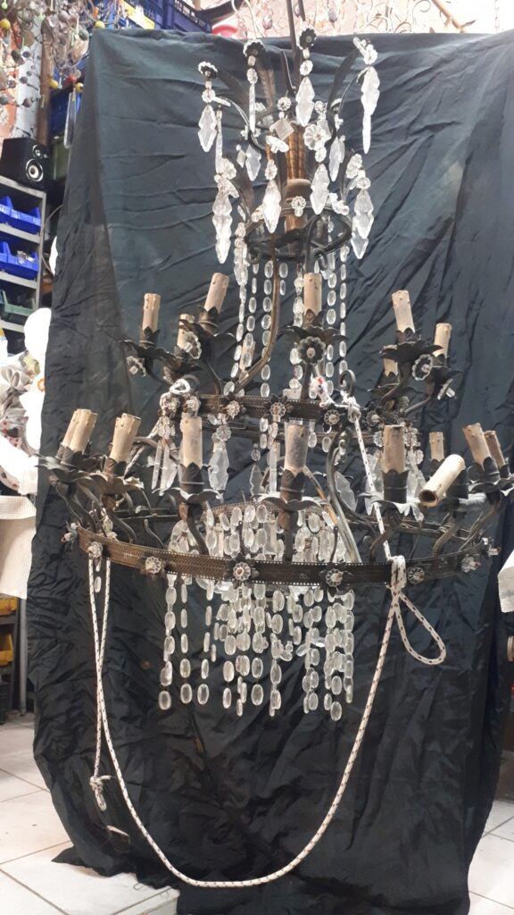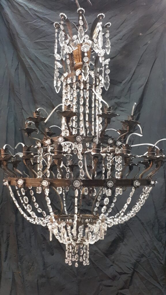 Questo lampadario in stile impero ma dei primi del ‘900 in seguito ad una caduta accidentale ha riportato danni sia alla struttura metallica che ovviamente a diverse parti in vetro, nelle immagini si vede come entra in laboratorio
