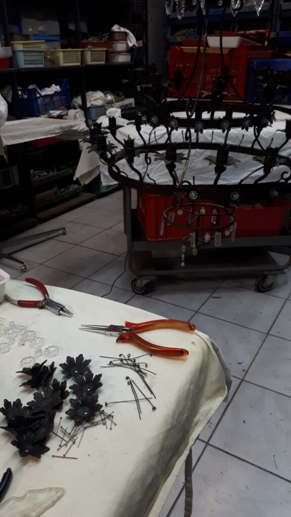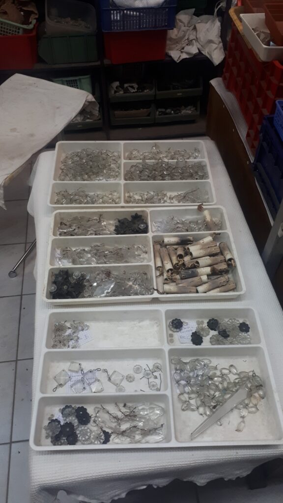 Il lampadario viene completamente smontato ,non prima di aver accuratamente preso tutti i riferimenti necessari per il successivo montaggio , poi tutte le parti sia metalliche che in vetro passano al reparto lavaggio